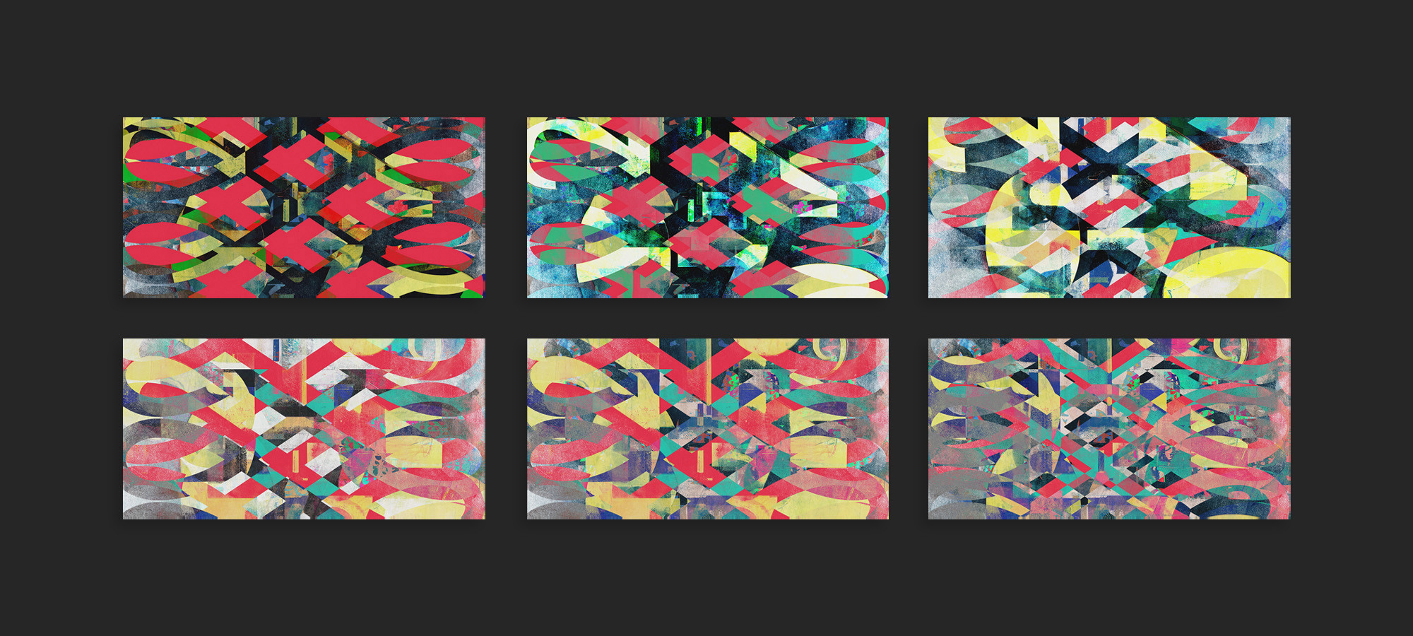 The graphic series (Lindlip, Lipsum, Folyoda) based on each other are characterized by coloured surfaces, stylized shapes, transparent layers, letters and numbers, sometimes hidden characters and motifs.